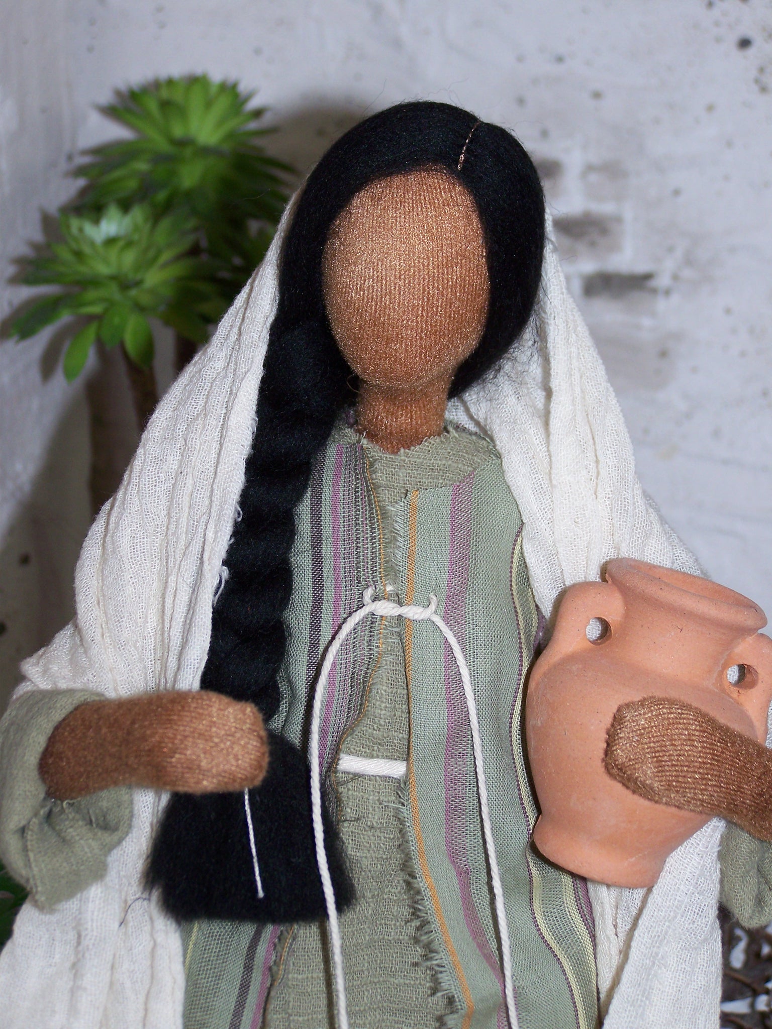 Ihr langes Haar ist zum Zopf geflochten.Im Arm hält sie einen Wasserkrug.