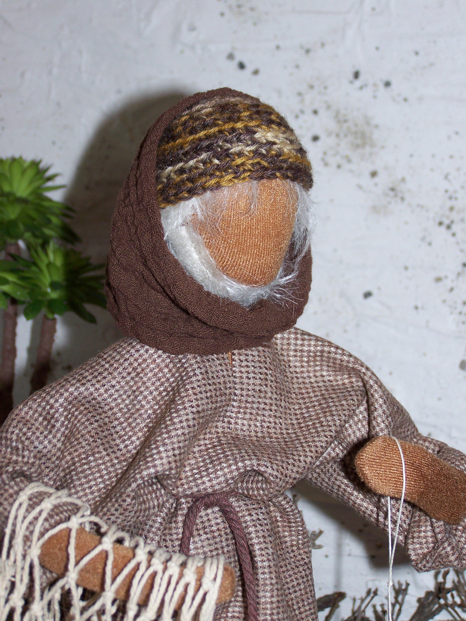 Eine gehäkelte Kappe dient als Kopfbedeckung.