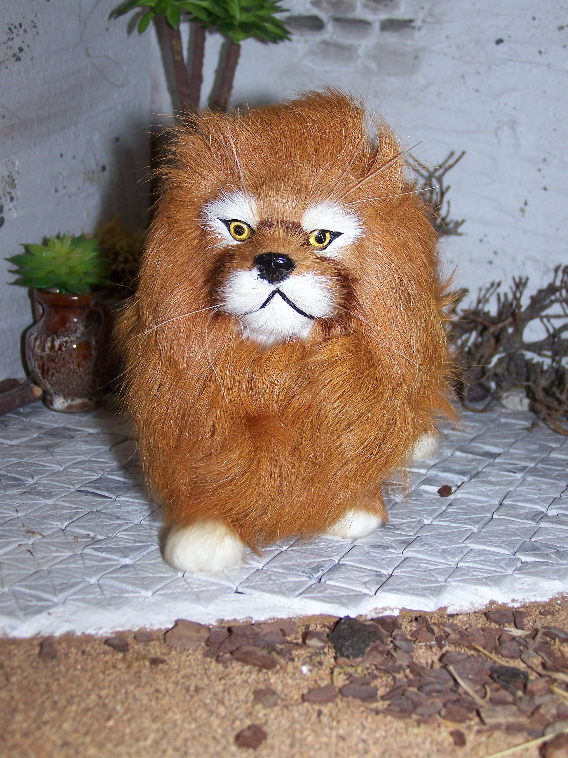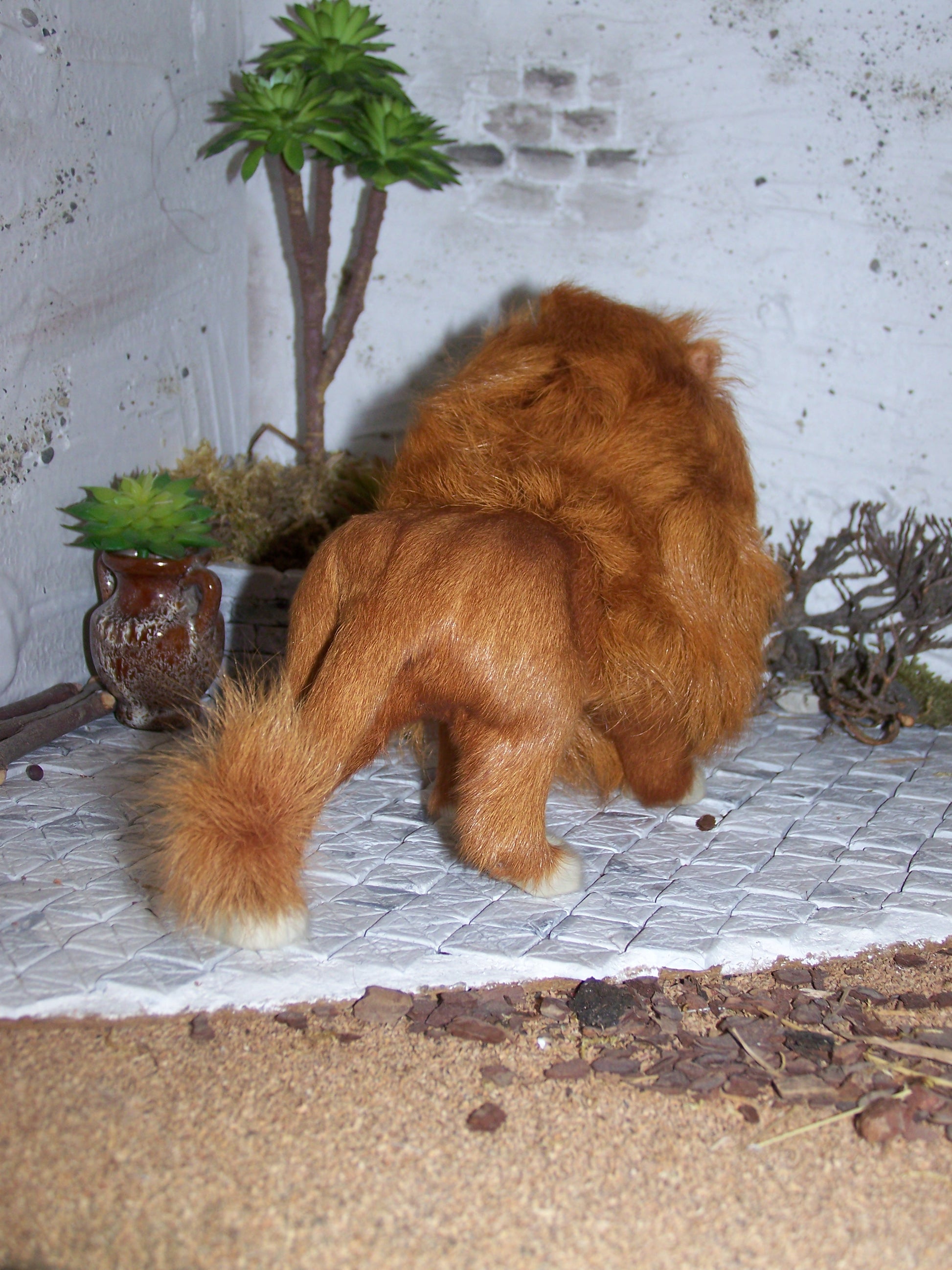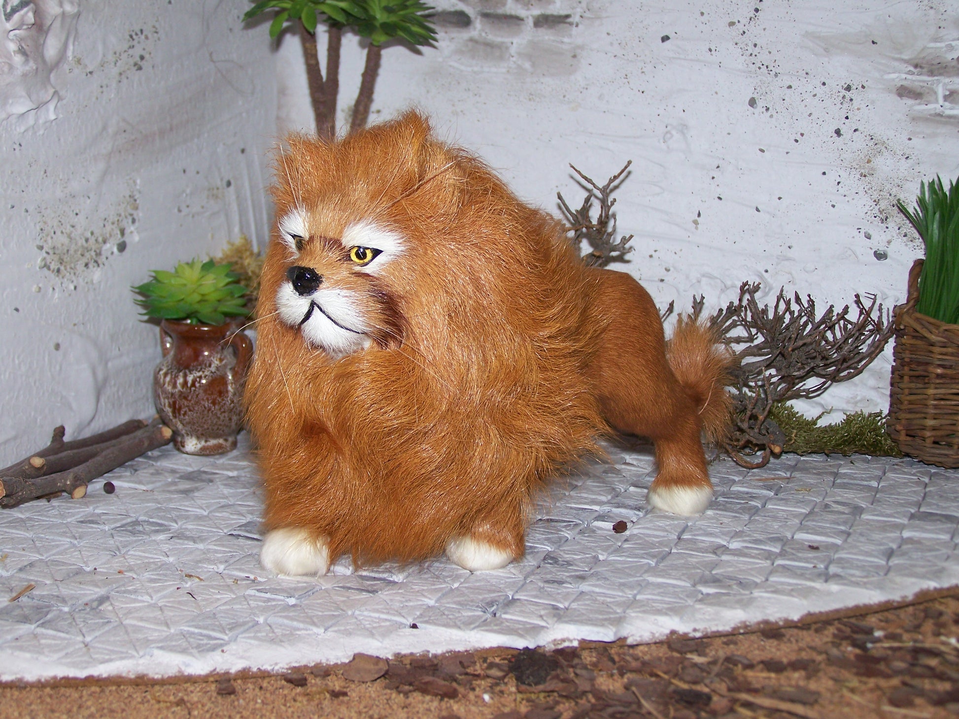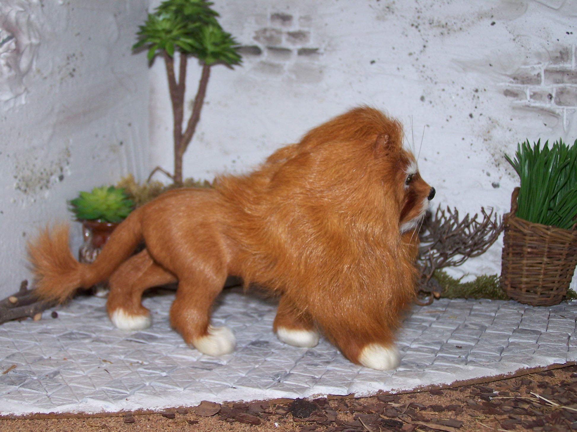 Er ist aus echtem Fell und ist aufgrund seiner Größe und der Löwenmähne ein beeindruckendes Tier.