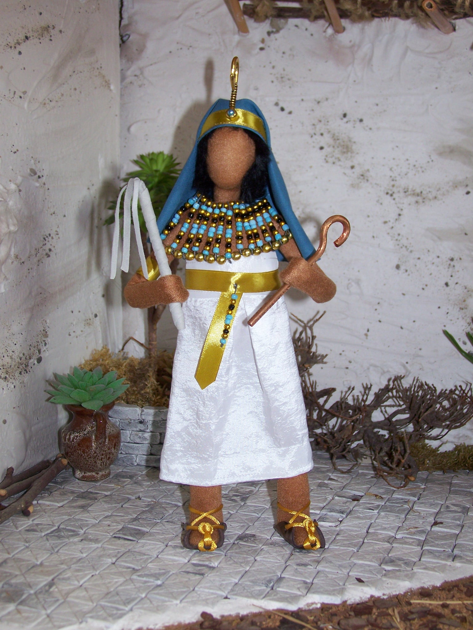 Der ägyptische Pharao ist aufwändig gekleidet, und hat seine Insignien mit dabei.