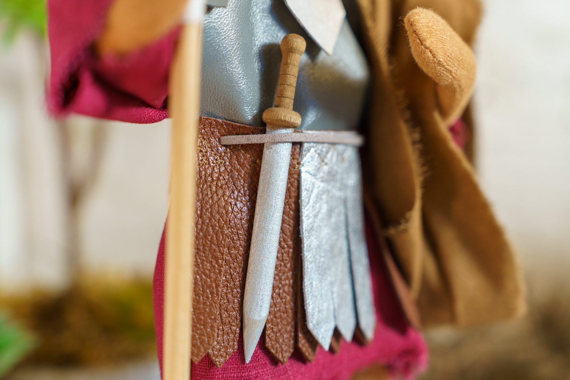 Der Soldat trägt über seinem leinenen Hemd einen ledernen Waffenrock.