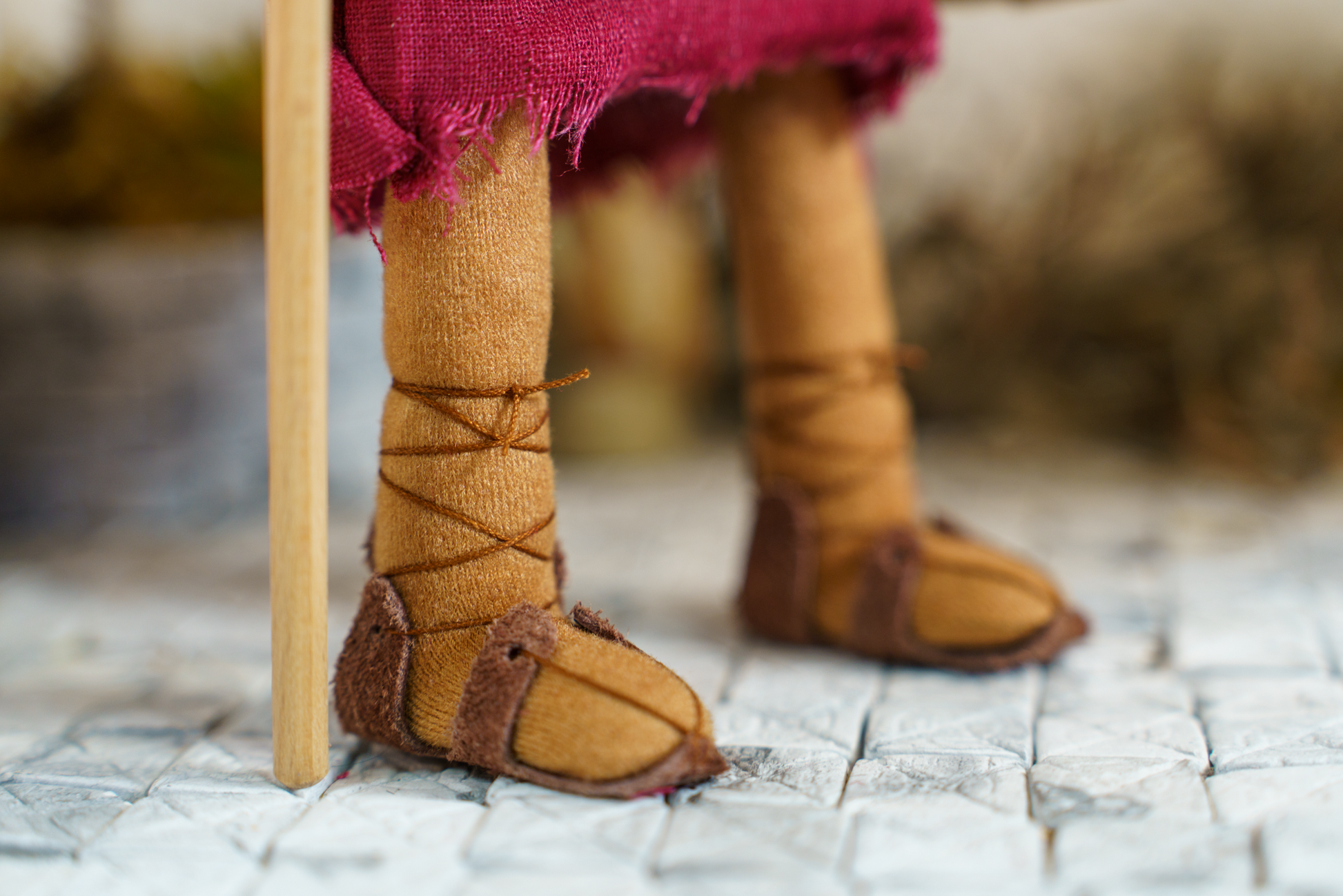 Geschnürte Ledersandalen und ein Helm, aus nachhaltigem Kunststoff aus eigener Fertigung, vervollständigen seine Bekleidung.