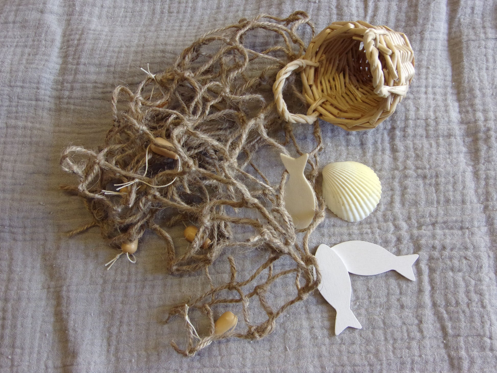 Das Zubehörset enthält ein großes Fischernetz, einen Fischkorb, eine Muschel und mehrere Holzfische.