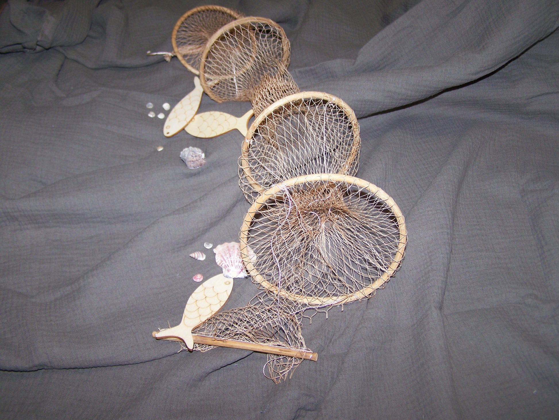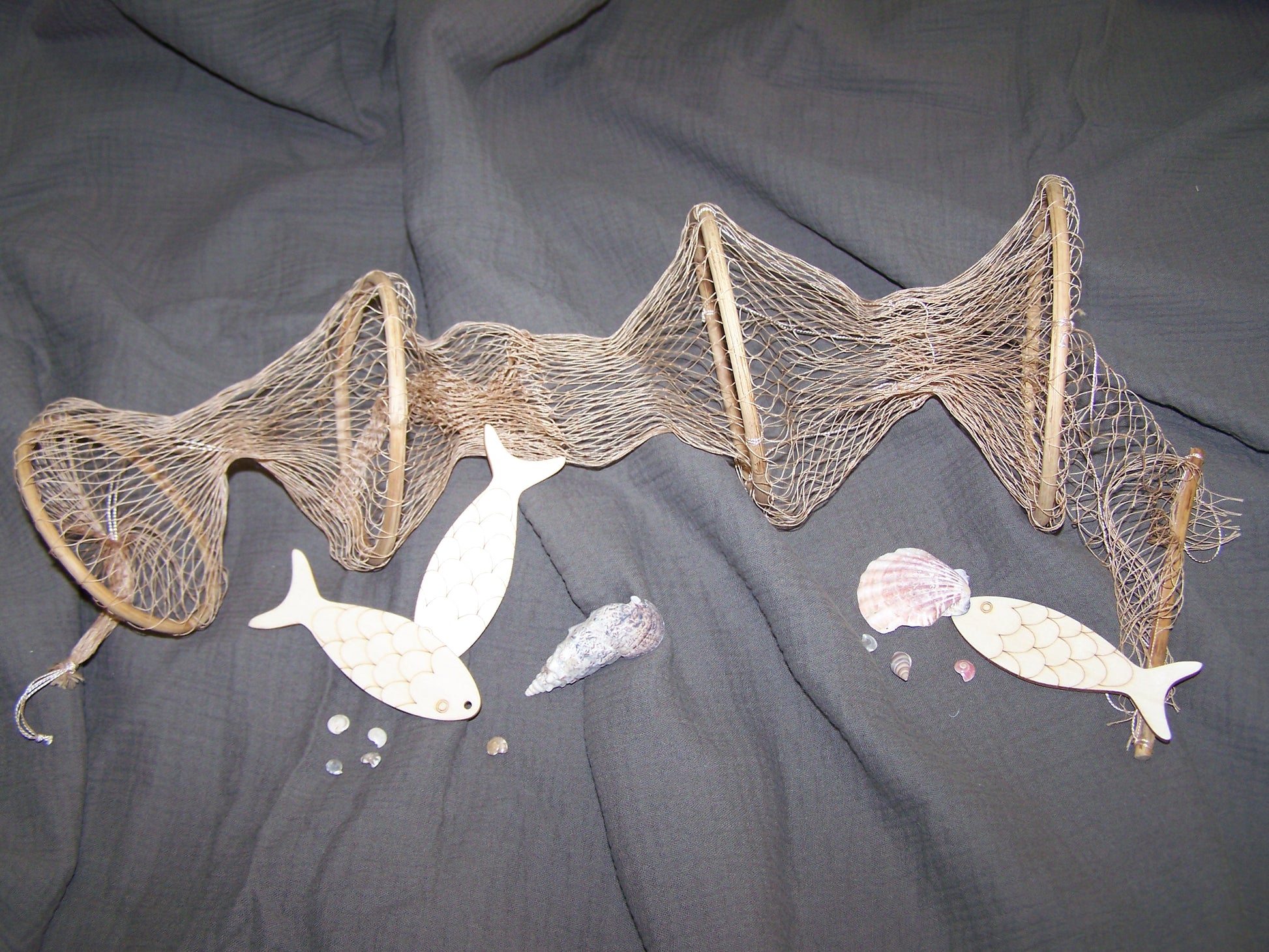 Das Zubehörset enthält eine ca 60cm Fischreuse aus sehr feinem Garn, das auf Bambusringe gespannt ist. Mit dabei sind mehrere Muscheln und drei große Holzfische.
